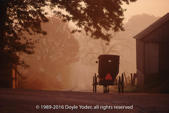 Mt Hope, Holmes Co. Ohio Foggy sunrise with open buggy going past on road