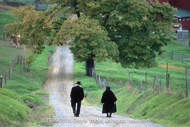 Walnut Creek, Holmes Co. Ohio Orange tree along road with farm building white barn behind family walking away on road