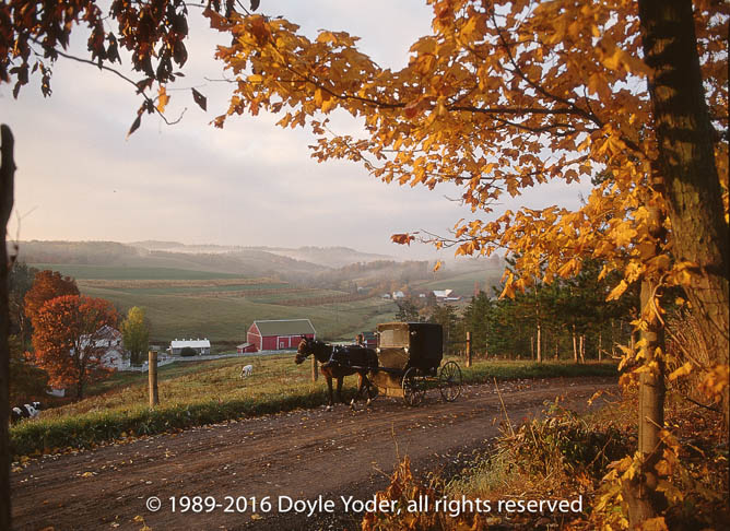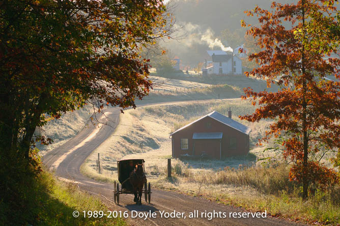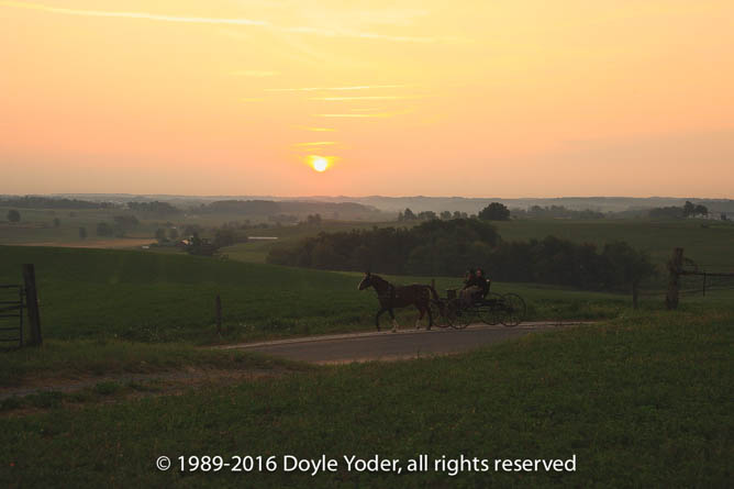 New Bedford, Holmes Co. Ohio Sunrise with fog in valley and buggy going past on road