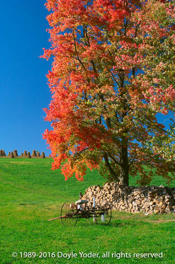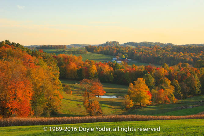 Farmerstown, Holmes Co. Ohio Bright red tree with farm red barn in valley behind Hack going by on road