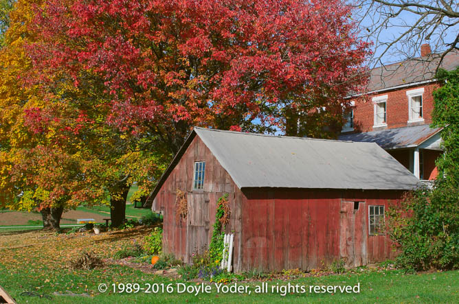 Fredericksburg, Wayne Co. Ohio Bright red tree along road by flower bed with white barn behind Buggy coming down road