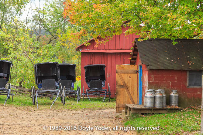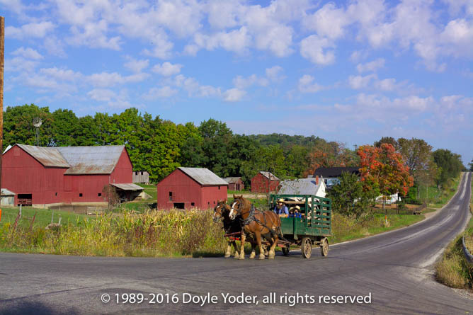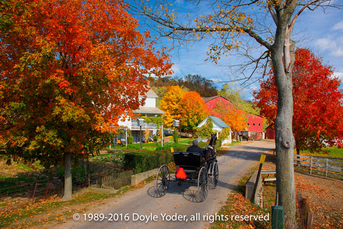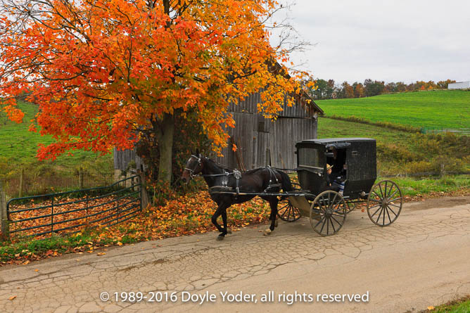 Becks Mills, Holmes Co. Ohio Buggy coming up road with bright colored trees and white barn behind