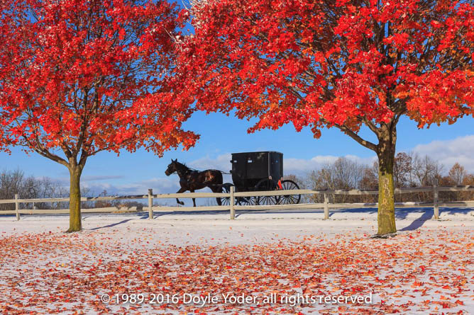 Farmerstown, Holmes Co. Ohio Bright red tree along road with buggy coming down road