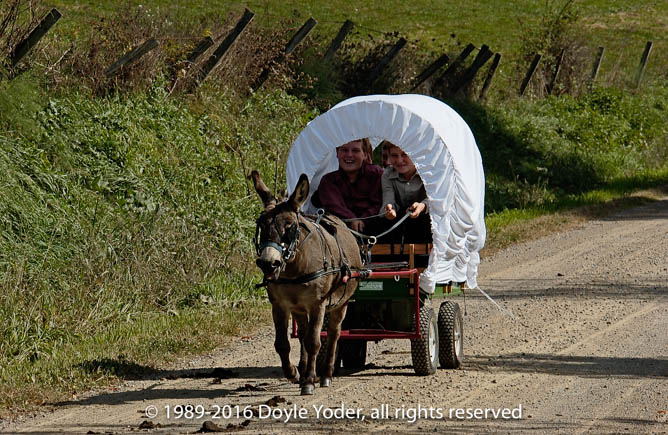 Farmerstown, Holmes Co. Ohio Young boys in wagon being pulled by small burro coming up road