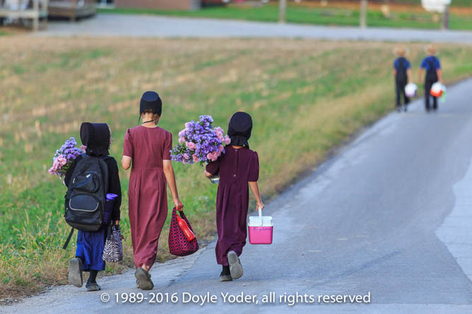Becks Mills, Holmes Co. Ohio Children walking home from school coming up road with bright colored trees and white barn behind