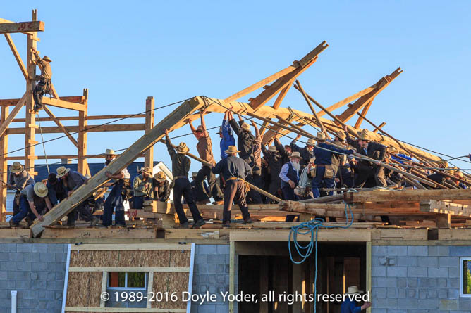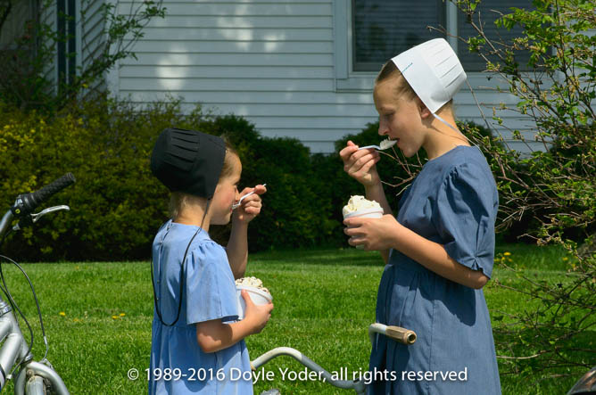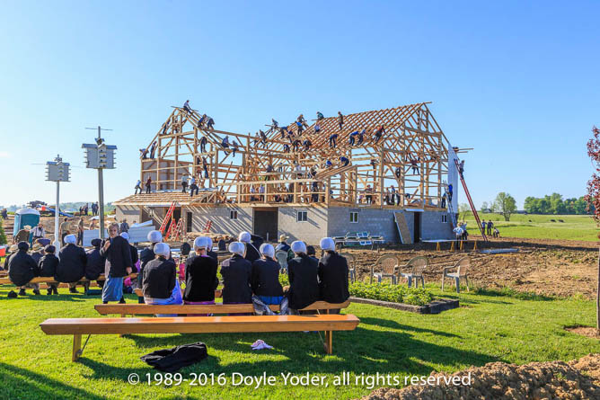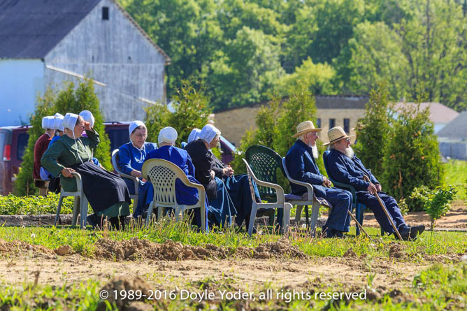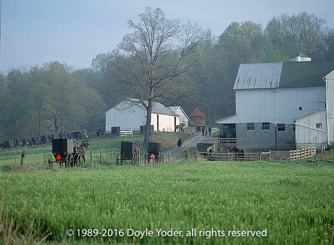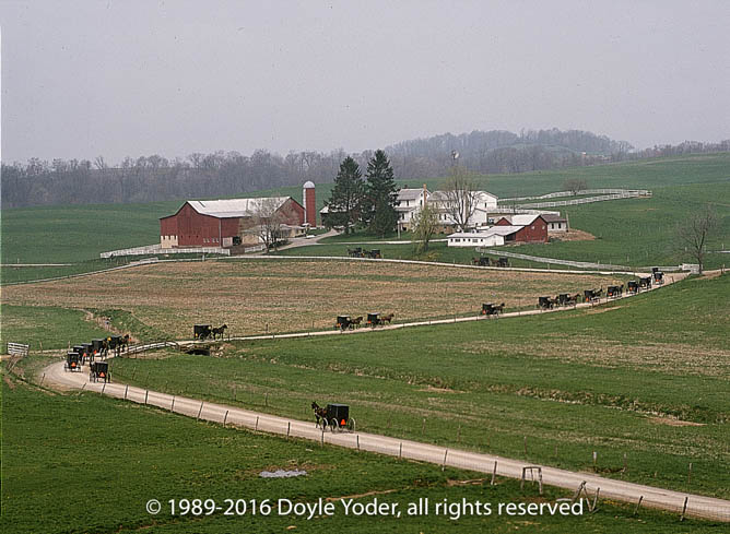 Shreve, Holmes Co. Ohio Buggy going away on road and people walking past flowers and lilac bush towards farm house to church