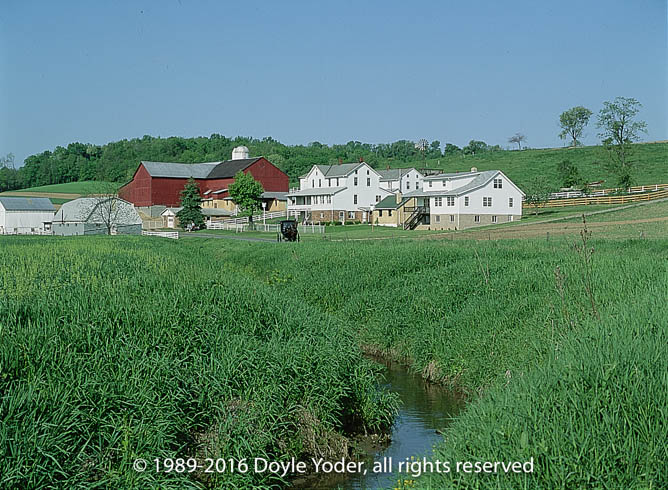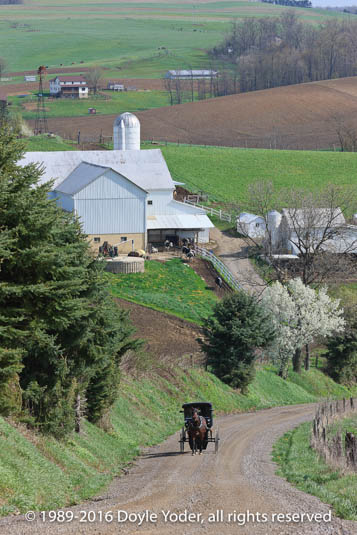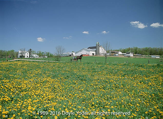 Walnut Creek, Holmes Co. Ohio Buggy going past on road behind daffodils in flower garden farm with white barn behind