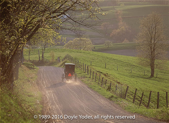 Berlin, Holmes Co. Ohio Buggy coming up road beside blooming trees with storm clouds behind