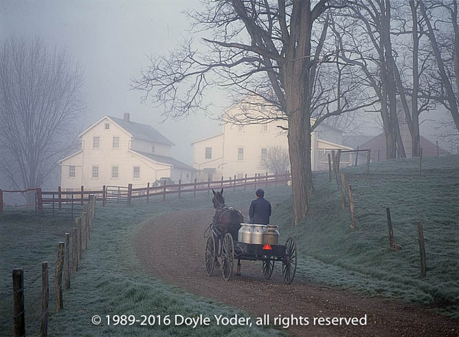 Keene, Coshocton Co. Ohio Milkcans sitting by road with farm house and shed behind buggy going past on road