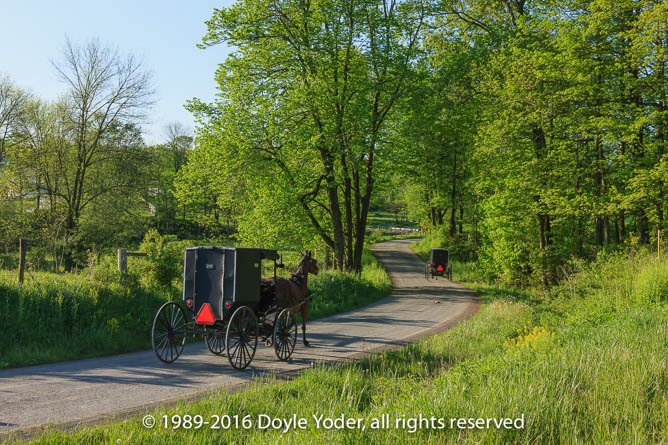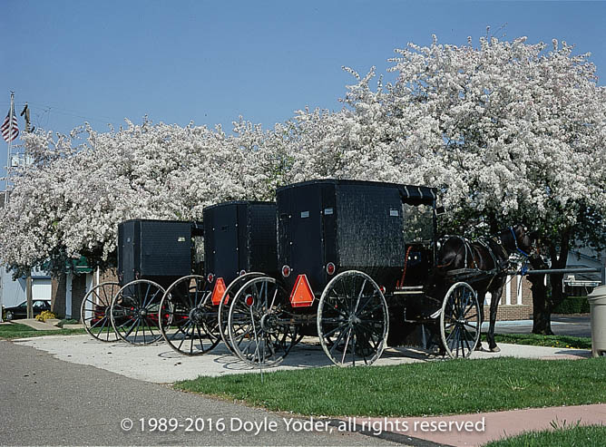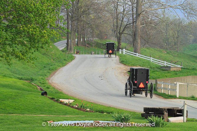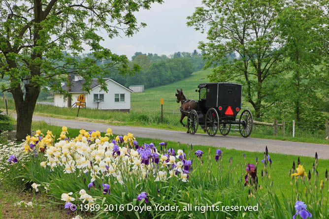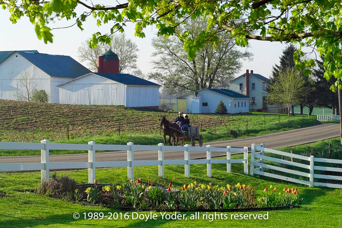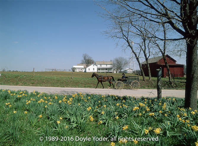 Millersburg, Holmes Co. Ohio Daffodils in flower garden with buggy going past on road