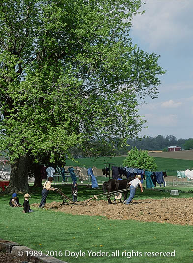 Mt Hope, Holmes Co. Ohio Team of five horses pulling spring harrow and team of two horses pulling corn planter in field behind wagon