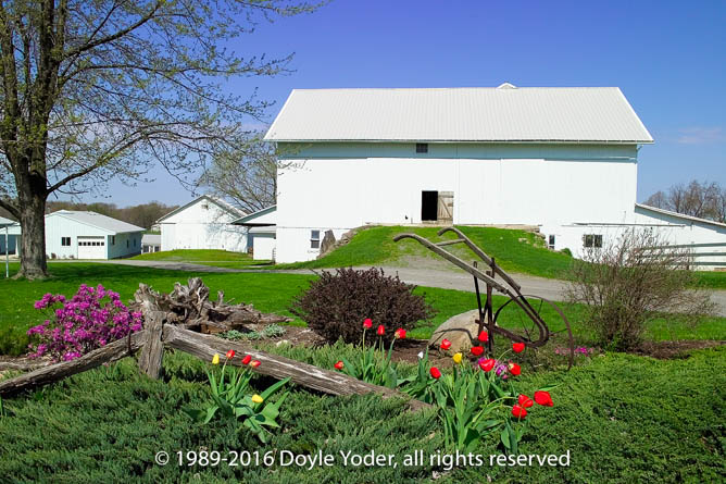 Charm, Holmes Co. Ohio Daffodils in flower garden with farm white barn behind with buggy going by on road