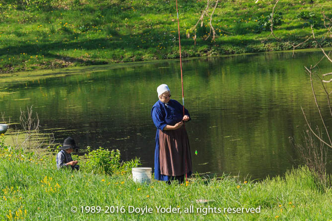 Families on bank and in boat fishing on pond with farm with red barn behind