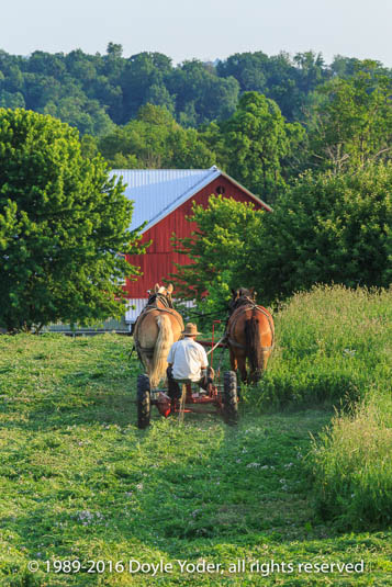 Becks Mills, Holmes Co. Ohio Five teams of horses pulling hay mowers in field
