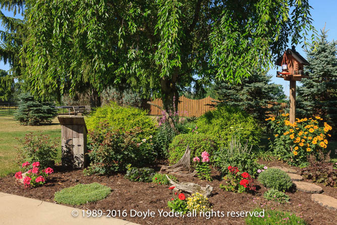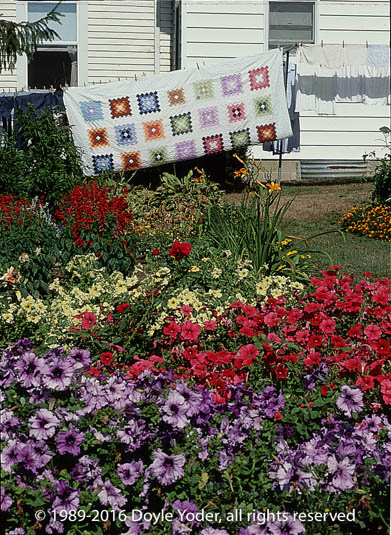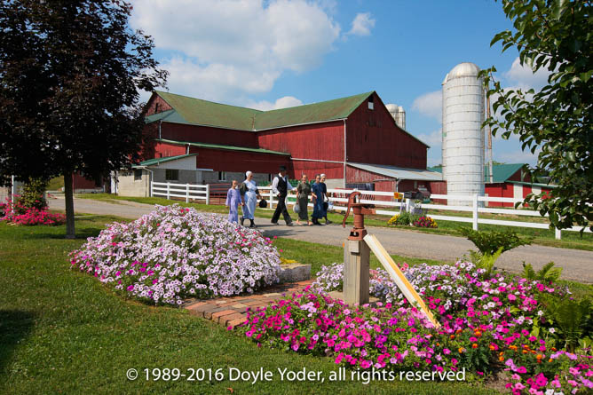 Charm, Holmes Co. Ohio Flower garden with farm house behind buggy going past on road