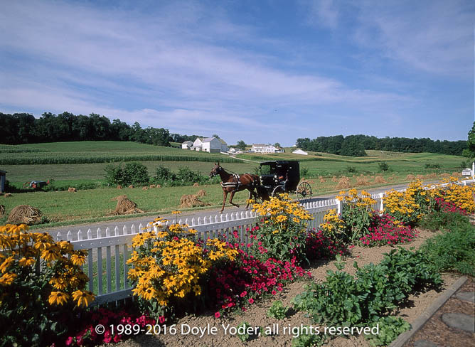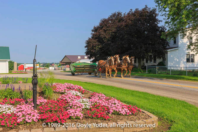 Mt Hope, Holmes Co. Ohio Buggy Flower garden with team of horses pulling wagon behind on road