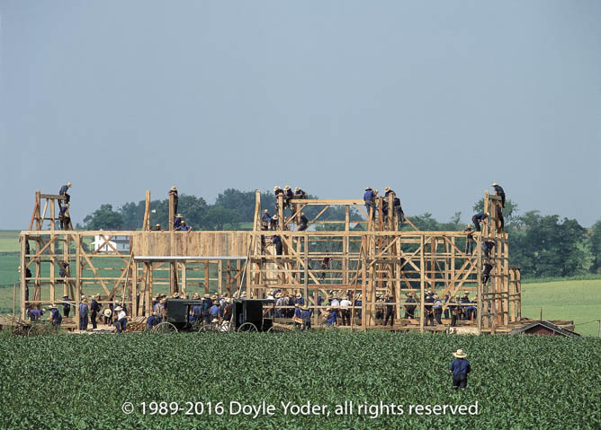 Barn raising at Wayne Burkholder farm early in the morning with men putting up wall row of women looking