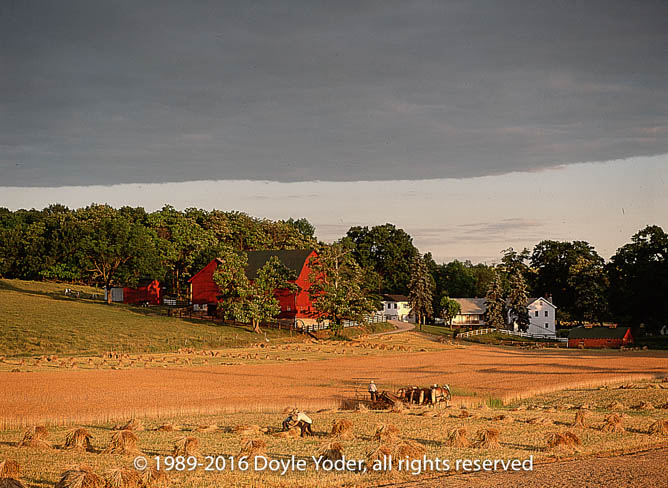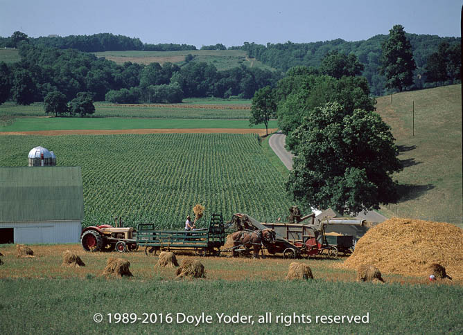 Charm, Holmes Co. Ohio Corn binder in field with wagons loaded with cornstalks heading for filling silo farm house and red barn behind