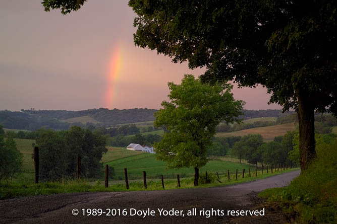sunrise over farm and road framed by trees buggy going away around curve at Henry Masts