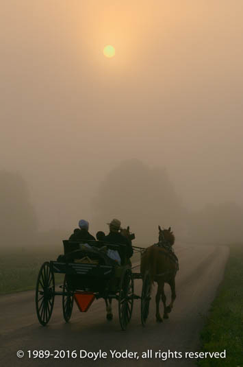 buggy going by on road cows by old log in pasture house in backround fog covered morning