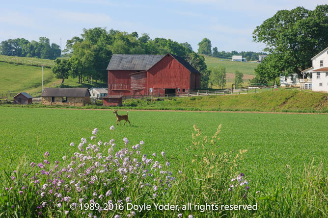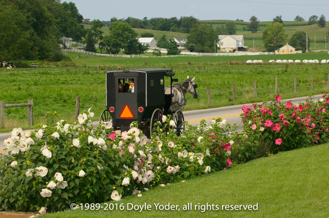 Ura D Miller roadcart going past Set Dannys flowers with white barn behind