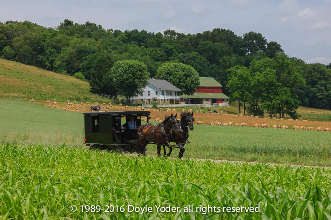 big white barn behind field full of wheat shocks, hack with milk cans on going away up lane