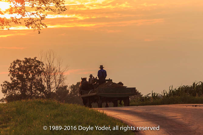 Becks Mills, Holmes Co. Ohio Boys and dad on wagon going away on road with sunset behind