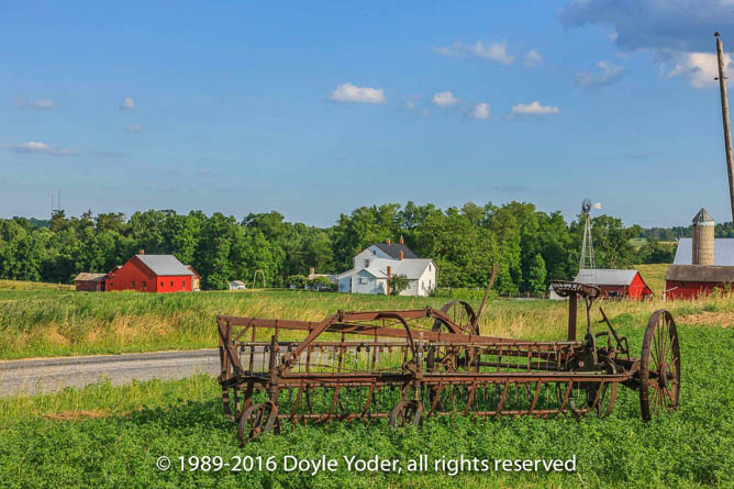 Walnut Creek, Holmes Co. Ohio Girl driving team of three belgian horses pulling hay rake with farm houses and red barn behind