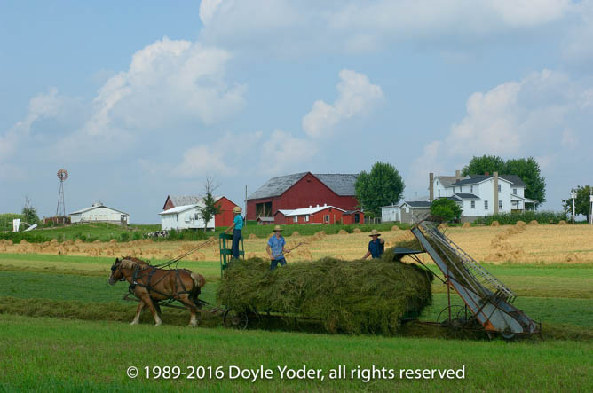 Walnut Creek, Holmes Co. Ohio Girl driving team of three belgian horses pulling hay rake with team of four belgian horses pulling round baler with farm houses and red barn behind