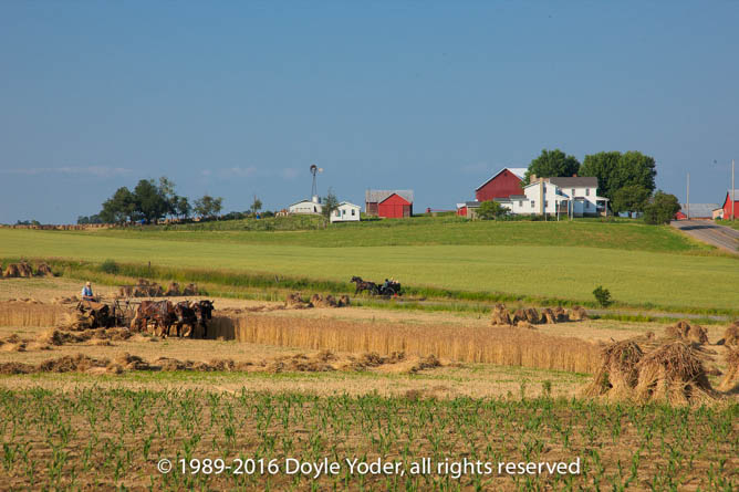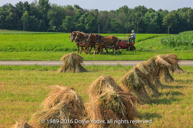 Mt Hope, Holmes Co. Ohio team of three belgian horses pulling grain binder in field