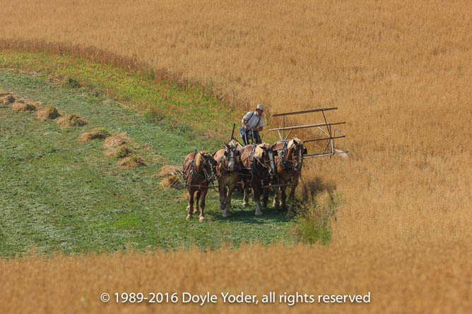 Farmerstown, Holmes Co. Ohio team of four belgian horses pulling grain drill with team of two belgian horses pulling hay rake