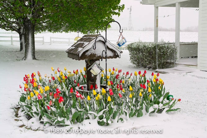 Berlin, Holmes Co. Ohio Spring snow with tulips in flower garden covered with snow